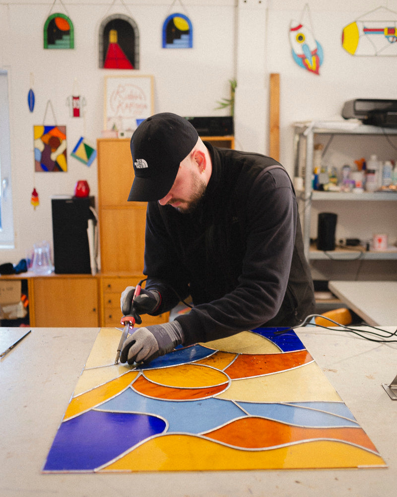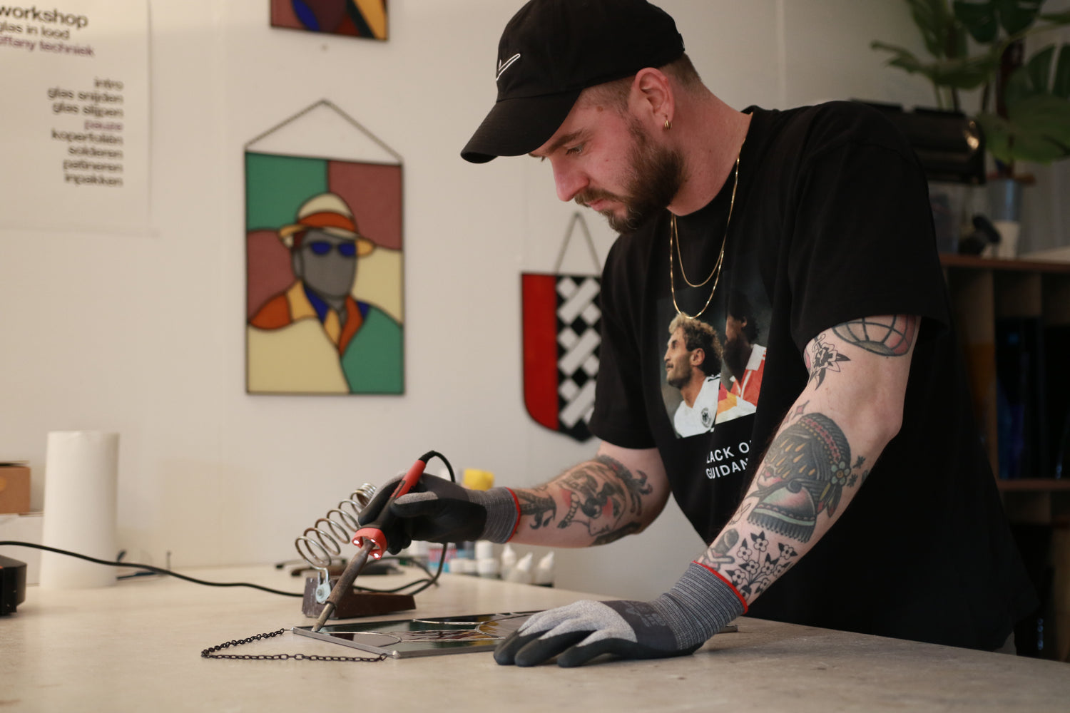 Als zelfstandig schilder kwam hij veel glas-in-lood tegen. Die vond hij meestal maar oubollig, dus vroeg hij zich af of dat niet wat meer eigentijds kom. Zo begon de Amsterdamse Robin Kapitein aan een zelfstudie glas-in-lood en deed hij verschillende cursussen, waardoor hij steeds meer zijn eigen stijl ontwikkelde. Zo'n tien jaar later heeft hij er zijn fulltimebaan van gemaakt: een combinatie van werk in opdracht, tentoonstellingen en het geven van workshops. Zo stond hij vorig jaar met een solo-expo in het Volkshotel. En glaskunstenaars in Spé kunnen dus ook in de leer bij Kapitein: in een dag tijd maak je een eigen ontwerp, waar je vervolgens je eigen glas-in-lood van maakt.