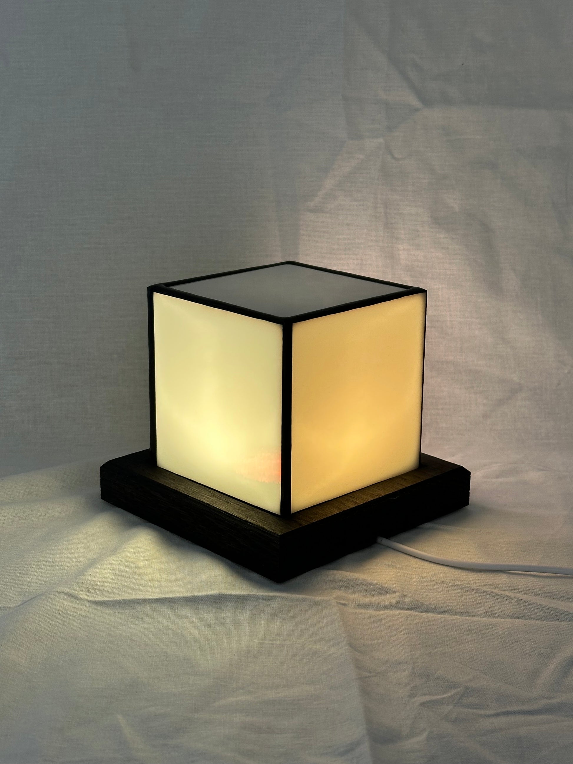 Maten lampje: 8,5x8,5x8,5 cm. Houten voet: 12x12x2 cm. Lampje wordt geleverd inclusief kabel en adapter.