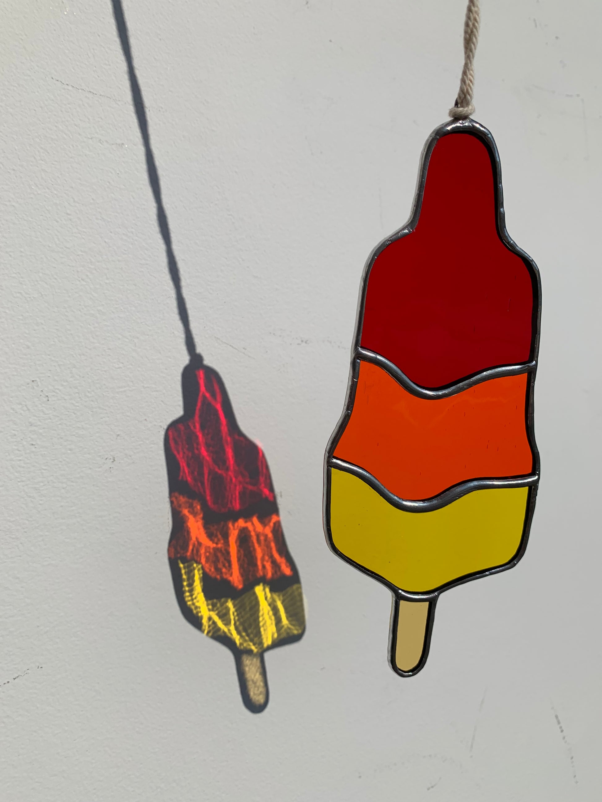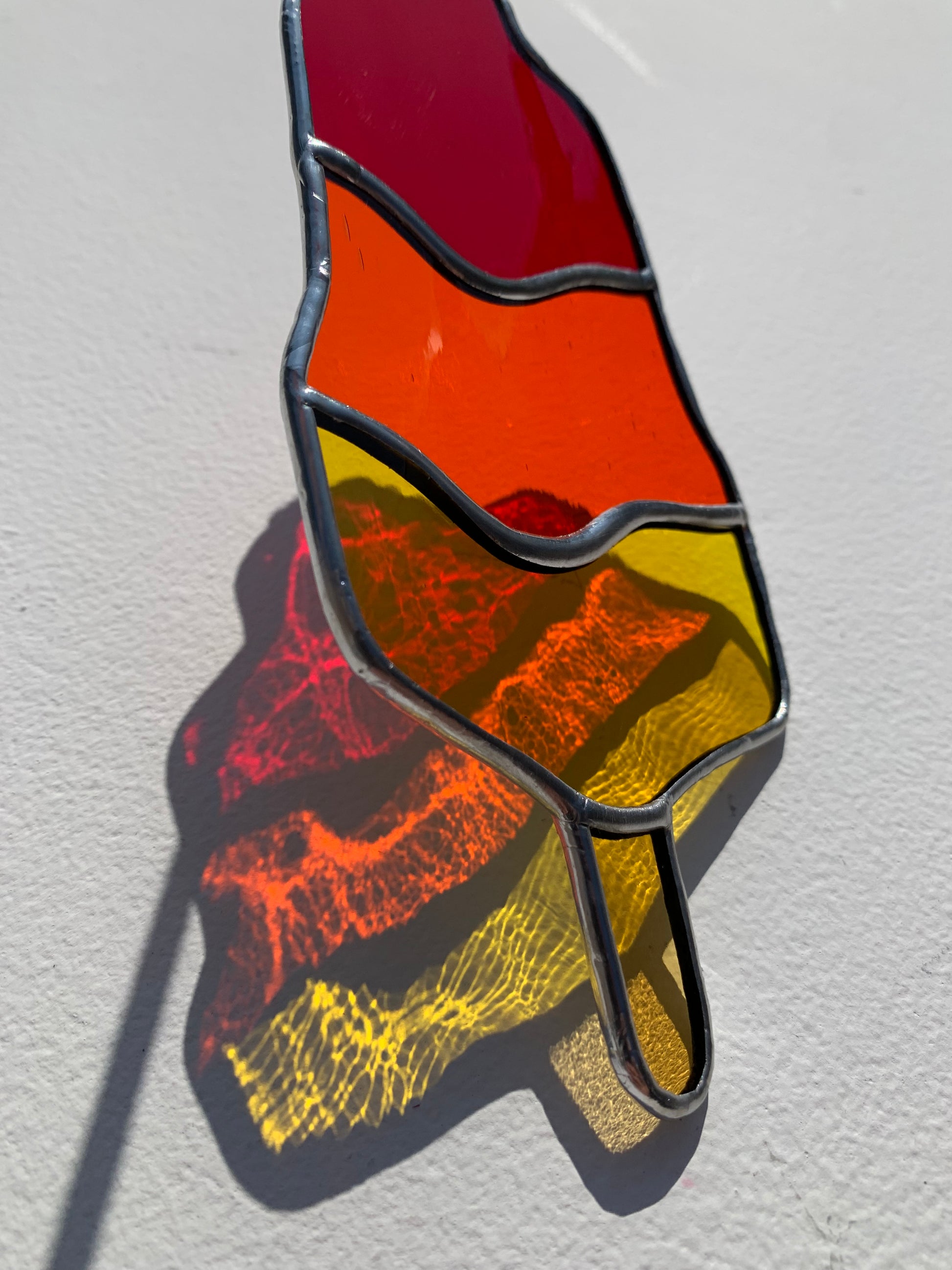 Vakkundig vervaardigde glas-in-loodkunst die unieke kleurrijke schoonheid aan elke ruimte toevoegt. Dit stuk is 17x6,5 cm groot en wordt geleverd met touw om het werk aan je muur of voor je raam te hangen.