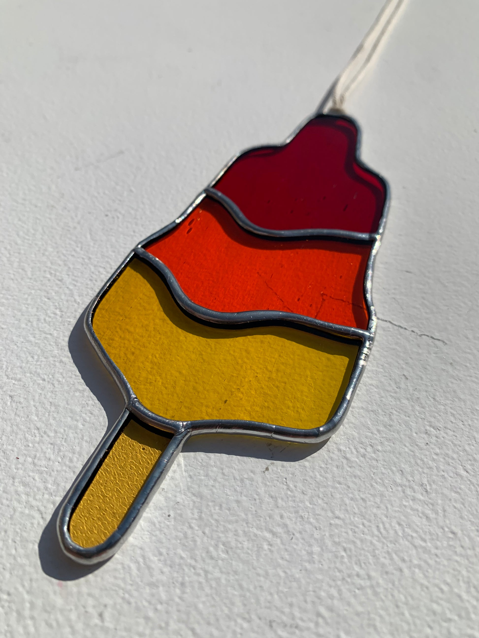 Expertly crafted stained glass art that adds unique, colorful beauty to any space. This piece is 17x6,5 cm and comes with rope to hang the piece up on your wall or in front of your window.